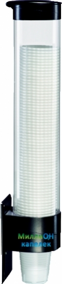 Ёмкость для стаканчиков изготовлена из прозрачного пластика, а крышка и крепёжная часть из пластика черного цвета.