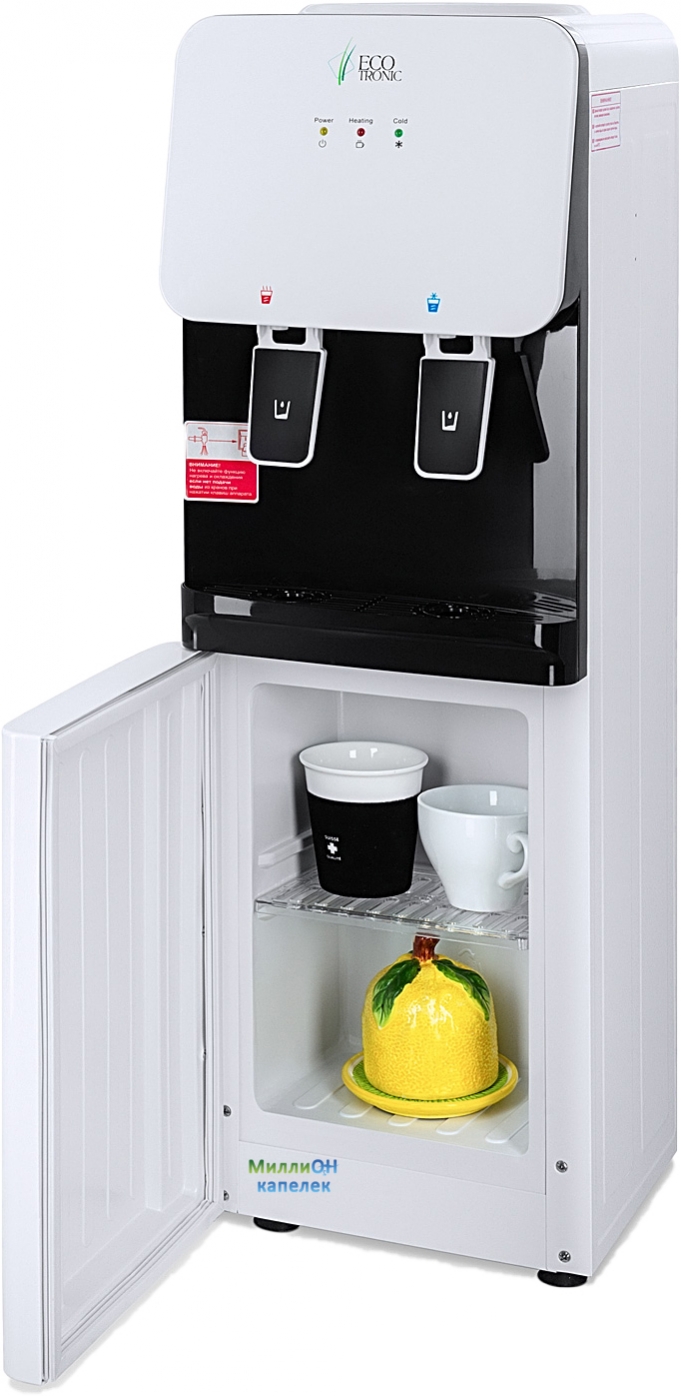 Кулер Ecotronic J1-LCE XS - "сверхбюджетный", компактный кулер для воды с функциями нагрева и охлаждения. С небольшим шкафчиком в нижнем отсеке. Электронное охлаждение. Корпус белого цвета с черной вставкой в области кранов подачи воды. Индикация режимов нагрева, охлаждения и готовности воды. Краны «нажим кружкой». Высота аппарата 0.85м.