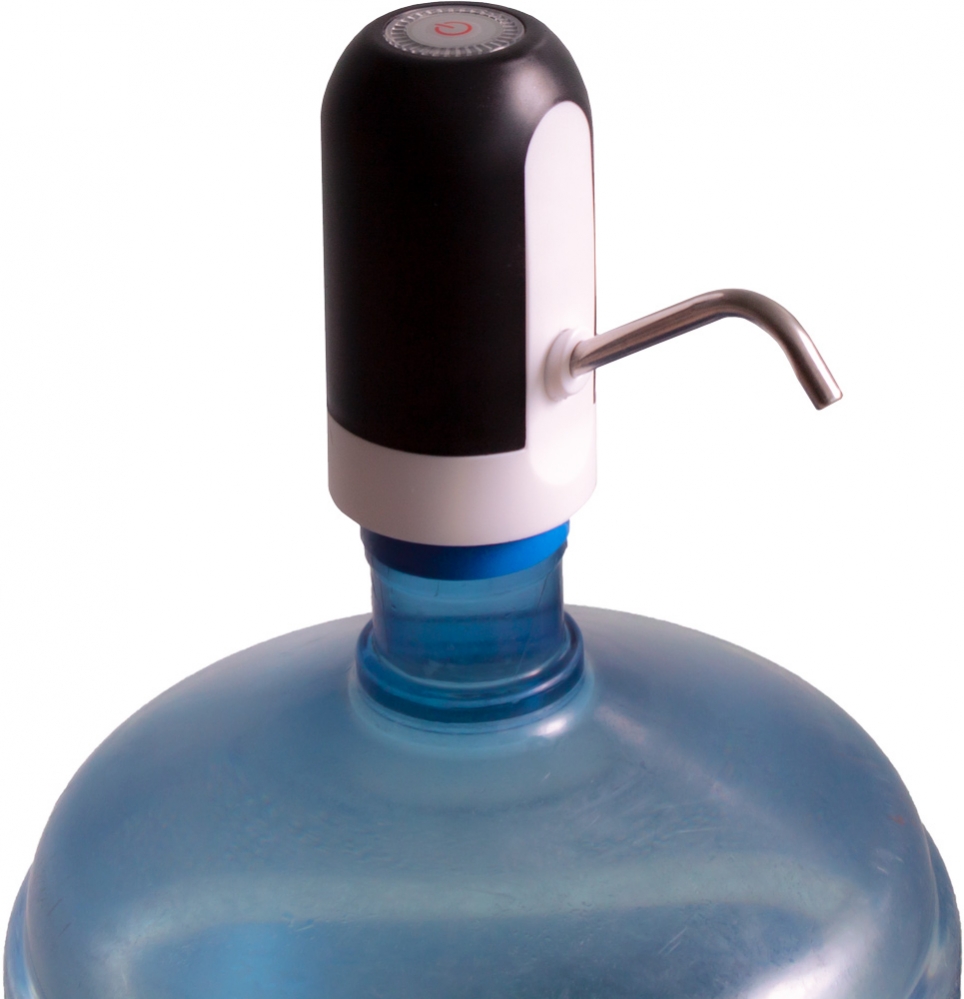 - Поднесите к кранику пустую емкость и нажмите на кнопку-индикатор на верхней грани помпы.